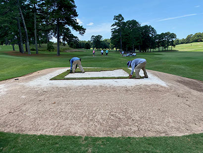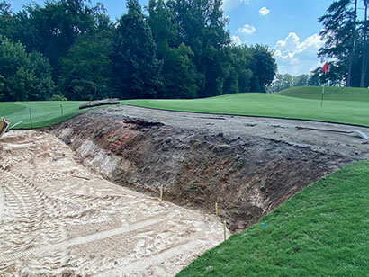 The face of this bunker had to be renovated due to a deluge of water that washed all the existing soil from under the turf on the face. We consulted with our golf course architect and created a plan on how the bunker should be remediated.