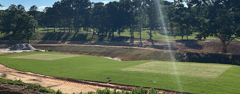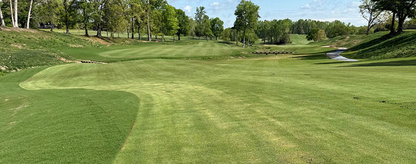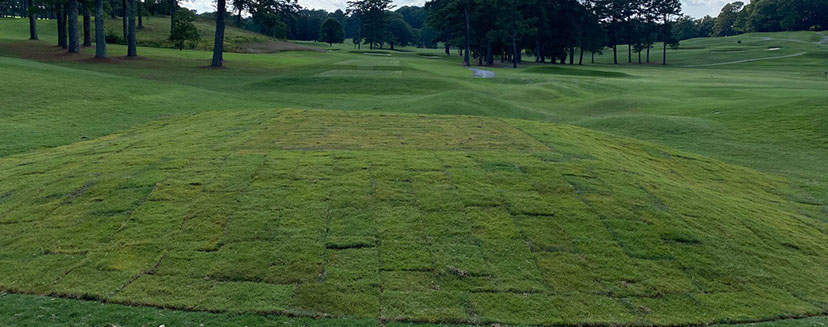 The turf in this fairway needed to be replaced due to shade and the slope being north facing (winterkill damage). Everything was sprayed with non-selective herbicides and then all dead material was stripped and removed. The slopes in this fairway were altered to be less severe and channel water towards the drains at the bottom. It was regraded and then sodded with new Tahoma 31 Bermudagrass.